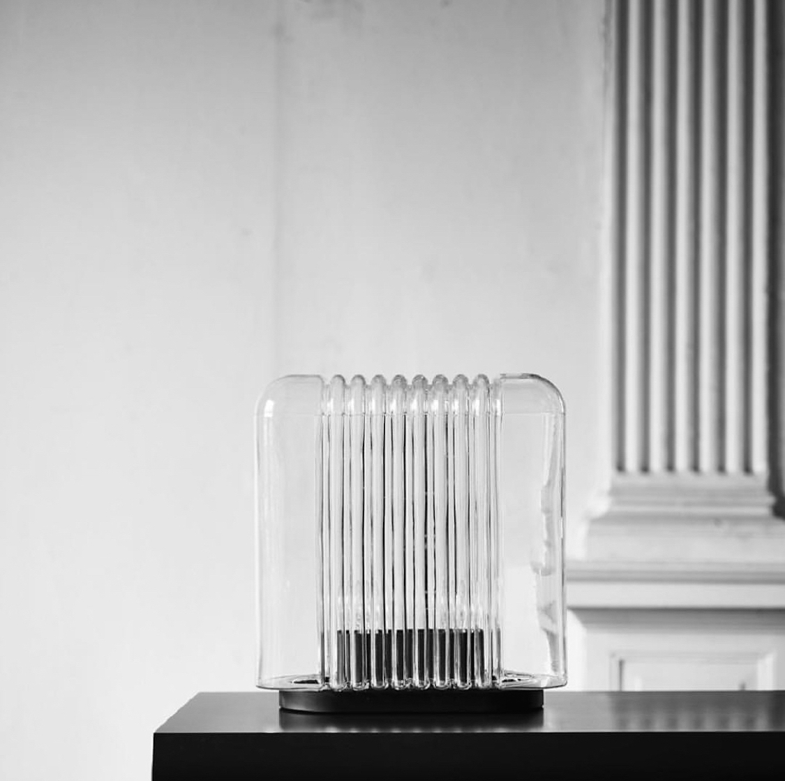 slavni arhitekt, kipar i dizajner Angelo Mangiarotti osmislio je lampu Lari koja istovremeno može biti stolna ili podna lampa. očit je utjecaj arhitektonskog pristupa poznatog autora, a posebnost lampe, osim oblika, je puhano staklo u jednom komadu od kojeg je izrađena. osim značajnih arhitektonskih djela po cijelom svijetu, radovi ovog majstora mogu se naći u Centru Pompidou u Parizu, Triennale Design Museumu u Milanu, itd… ova lampa, kao i ostala njegova djela, zrači skulpturalnom snagom koja ju smiješta u domenu arta.
